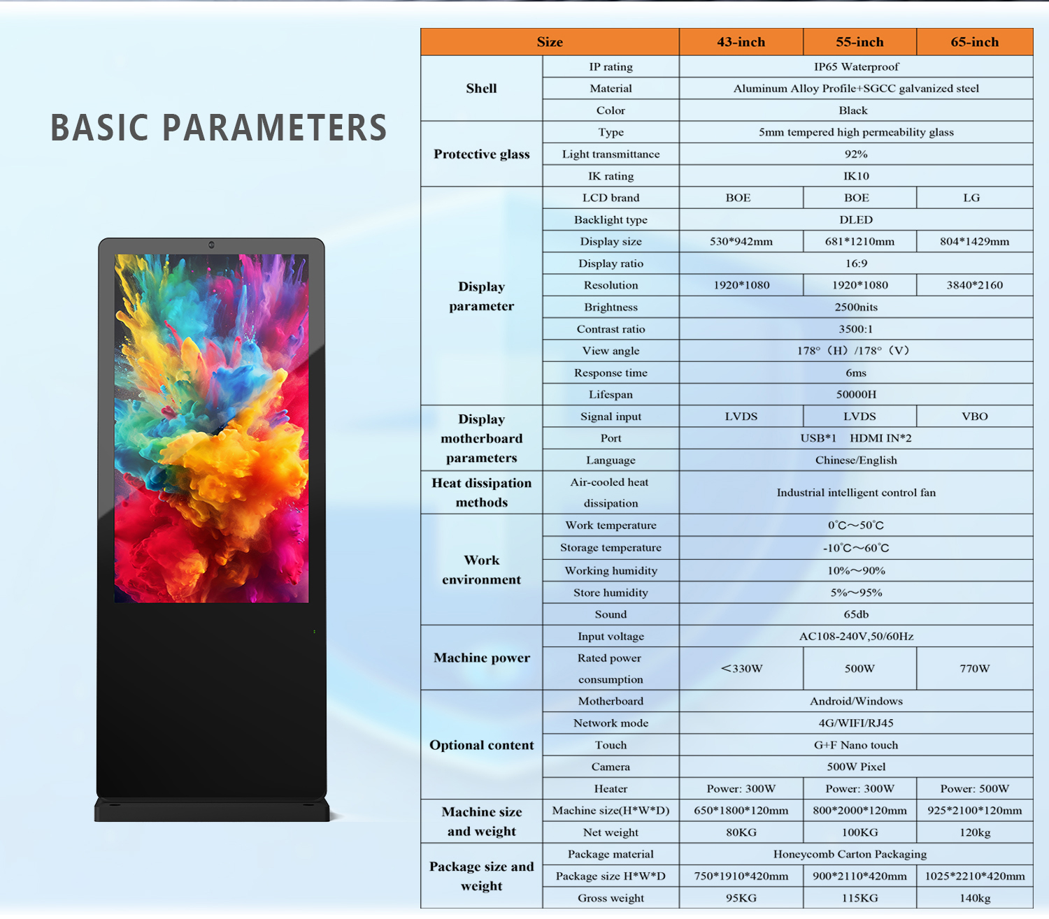 | Display dimension | 1429*804mm | 1651*929mm | 1896*1066mm | 2159*1380mm | |